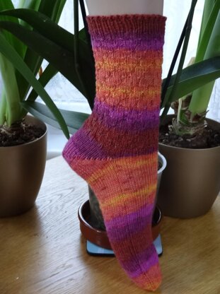 I hope you enjoy this as much as she did. Just as a reminder, you should always try on the sock after you have completed the heel to make sure it fits as you wish. Some people prefer socks a little tight and some a bit looser so I can only make a general specification. If you want to change the fit you can change the needle size. If you change the number of stitches make sure they are divisible by 6 before you start the cuff pattern.