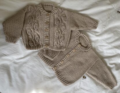 Instructions are given for the cardigan in three sizes, 0-3 months, 3-6 months and 6-12 months. The generously proportioned cardigan, with minimal shaping, features all over pattern in a simple seed stitch (also known as moss stitch) with an unusual 2 + 1rib. If you can knit and purl, you can make this simple yet classic cardigan. For the more experienced knitter an alternative pattern is provided to make the garment with leaf panels up both fronts