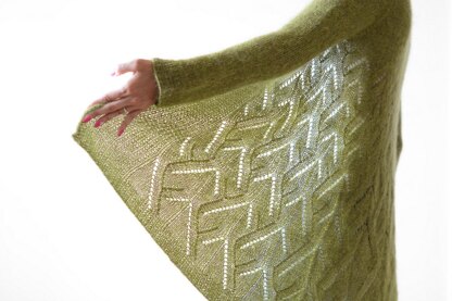 Soyokaze - breeze - is a long A-line cardigan with feminine lace pattern on its entire lower body. It is worked from the top down seamlessly with two strands of yarn held together throughout. The collar is worked first in irregular rib with slipped stitch edge (SSE), then stitches are picked up along collar edge for yoke. The front and back are joined at the underarm where sleeve stitches set aside, and the lower body is knit in one piece to the hem with Soyokaze lace pattern which grows in width and length. Sleeves are worked top down in the round. Do not pull yarn too tightly when working SSE.