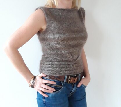 The Sparkles sleeveless cable top is worked in one piece from the bottom up until the armhole shaping, at which point the front and back are knit separately. The cable binding is worked first, then sewn together to form the hemline that the top is then cast onto. The yarn chosen for the model (size S) is a combination of Lana Grossa Silkhair Lusso (a mohair with some shimmer in it) and Lana Grossa Cashmere 16 fine, which gives it a more glamorous look. You can of course opt for any other combination, or a single thread of any DK or light worsted yarn (cat. 3) that fits the indicated gauge.