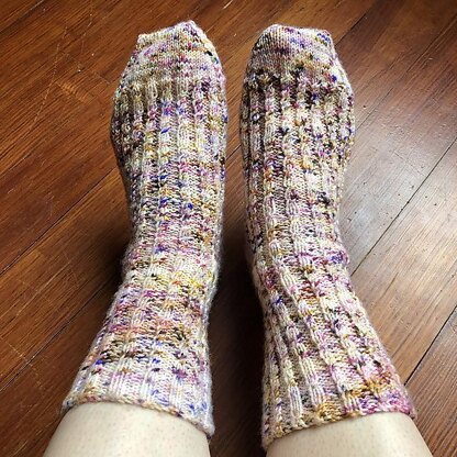 Handpainted & speckled yarns can be quite irresistible! However, they can be difficult to match to a pattern. Patterns that are too complex can be obscured by the speckles and vice versa. Patterns that are too plain are just not as fun to knit. Don’t let those beautiful handpainted & speckled yarns languish in your knitting basket for years! This rather basic ribbed sock with a heel flap and wide toe has small random-appearing cables that you pop in wherever the pops of painted color come up in the yarn, which keeps the knitting interesting, and also helps you to give up a little control with the randomness of the cables.