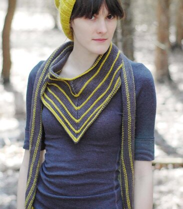 A snazzy lil’ scarfly thing with a bandana point, long cozy arms, and textured stripes. Knit from the bottom up.