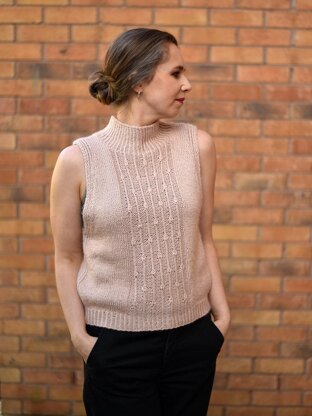 DESIGN OVERVIEW: Spelt slipover is a comfortable vest with deep armholes and fancy bobble stitch on front. Bottom band, neck and side panels knitted with twisted rib. The recommended positive ease (measured at waist) is 15-20 cm/6-8 inches. Front and back knitted bottom up on straight needles. After shoulder seams closed, the stitches picked up for neck band, which is knitted in the round.