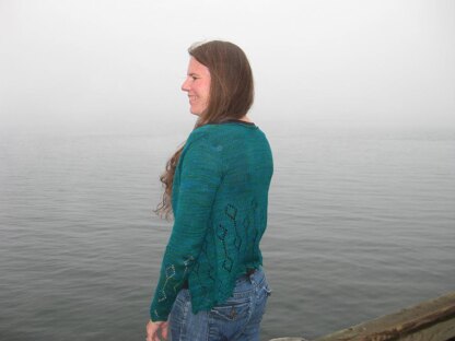 The Spelunking Cardigan is a waist-length lacy cardigan, featuring a lace edging along the bottom edge and on the sleeve cuffs. The lace motif reminds me of stalactites and stalagmites found in caves – hence the name. The body of the cardigan is knit in one piece to the armholes. Sleeves are knit flat and sewn to the body.