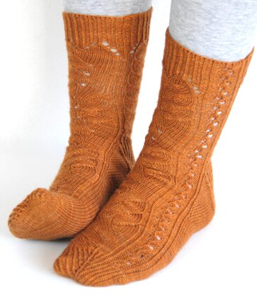 The pattern comes in three sizes (60, 64, and 68 stitches) and with two toe options. Both foot and leg length are adjustable within the stitch pattern. Right and left socks are mirror images of each other and can be worked two at a time.