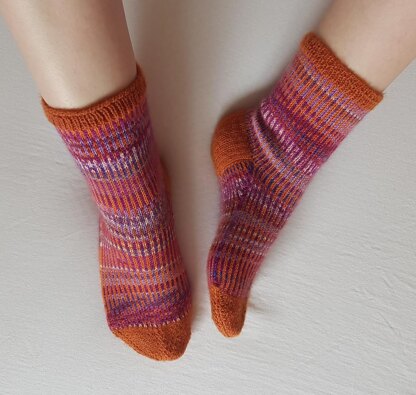 Colorful socks are inspired by the beautiful colors of the fall. Socks are worked in rounds, from top down. Sock elements: Cuff, Leg, Heel Flap, Heel Turn, Gusset, Foot and Toe