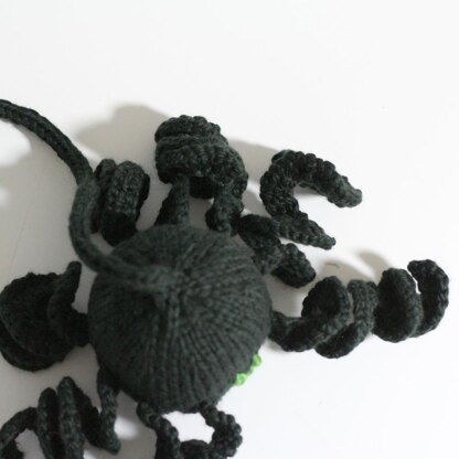 An October treat! Spider's body is knit in the round on double pointed needles - his magnificent curly legs use a long circular (or straights). You need to be able to increase, decrease, work a YO and manage icord if you want him to hang.