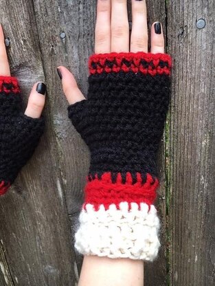 These crocheted mitts were designed to go with my Cascade spikes hat pattern, and are a great use for smaller amounts of yarn. With a ribbed cuff and flash of color at the top, they are a great way to show off team or school spirit!
