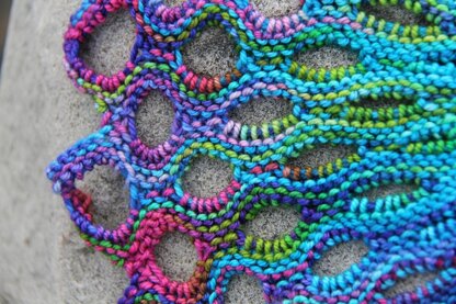 A decorative sideways-knit neck or wrist-warmer with short row shapings. These are enhanced by the use of scallop holes of different sizes. Minimal finishing is required. The final garment can be fastened with buttons or joined in the round.