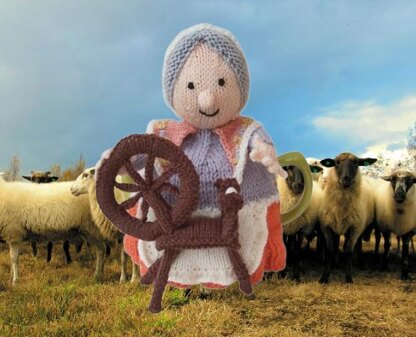 Meet Jenny, she spins yarn the old way on a spinning wheel, she has grey hair neatly tucked under a bonnet and she wears a beautifully detailed shawl adorned with a floral border, which drapes over her shoulders and adds a touch of colour to her ensemble.