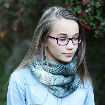 Spirit infinity scarf/cowl features diagonal lace pattern, knit in DK weight yarn.