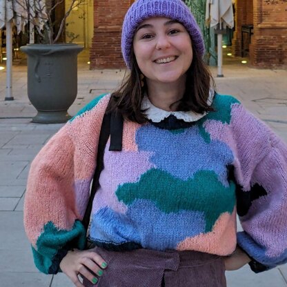 This playful and oversized sweater features a vibrant color block pattern and a textured fabric. The intarsia technique creates a unique and eye-catching design.
