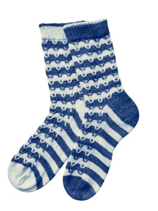 This very addictive pattern may look complicated, but it is surprisingly easy with fun slip stitches and a little cable to complete the motif. The stripes and the stitch motif combine to make these socks knit themselves. Even better, you can just carry your unused yarn up the inside of the sock…less ends to weave in!
