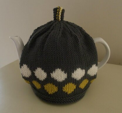 My niece bought her first house and as a housewarming gift I gave her a teapot with a cosy to keep the tea warm. As she’s young I wanted a simple, modern design for her and her husband although this will suit many people. I chose charcoal, white and corn yellow but there are endless possibilities for colour combinations. The spots only take a small amount of yarn so great for using up those little bits of yarn in your stash.