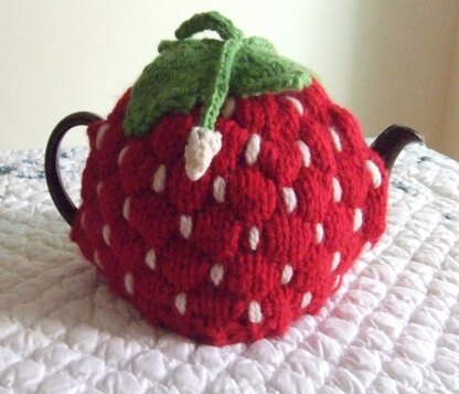 About the Design: This adorable tea cozy has spout and handle openings, so the cozy can remain on the teapot, whilst pouring, and comes in 2-3 and 3-4 cup sizes. This is an advanced beginner project – the stitch pattern is mostly Stockinette, with a pattern round of dropped sts – quickly learned. I used this stitch pattern to design the Strawberry Baby Blanket, so it may be familiar to some knitters already. The openings have a single crochet edging. Four leaves, an I-Cord stem and I-Cord vines, with newly forming white berries, embellish the top. White seeds are stitched on after the knitting is complete.