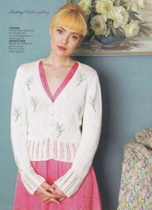 This is a pattern for a Sprig and Eylet Cardigan, originally published in Knitting magazine. It is knitted in stocking stitch with an eyelet lace border. The flowers are Swiss darned after knitting. Photos Knitting magazine.