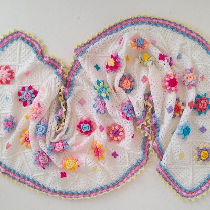 Crochet this colorful Spring Blossom Bed Runner using seven skeins of 100 gm (295 m) DK weight yarn in white and less than one skein of up to 15 additional colors (the additional colors are great for busting a yarn stash). Please note that any yarn can be used but may change the finished size. This pattern is based on the original 'Blush Blossom Baby Blanket' pattern also listed in this shop.