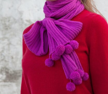 I found this yarn while traveling. It’s the color that got me–clear, vibrant fuchsia, a burst of spring any time of the year! To start, work the scarf using only the first hank. Decide how many pom-poms you want and where you want to attach them. Make the pom-poms, then continue working the scarf using the rest of the second hank. With a length of 76” or more, there is plenty of scarf to double–or triple-wrap it around your neck and tie it in a bow.