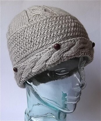 This hat starts with knitting the brim flat. A seam brings it together in a circle. Stitches are then picked up around one edge to form the crown. The cable edge is folded up and secured with 5 little buttons.