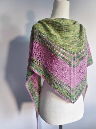 This shallow triangular shawl is worked bottom-up starting with the lace border, which is a mix of the garter stitch, lace and eyelet patterns. The lace border adds a delicate touch to this rather casual accessory. After the lace border is complete, the body is knit in garter stitch pattern and shaped into a triangle using short rows knitting technique.