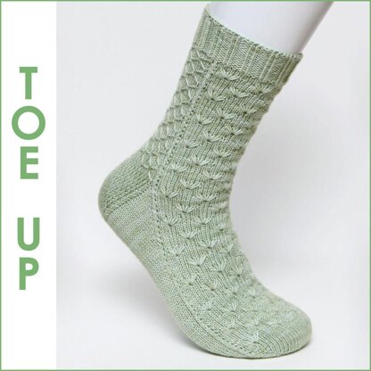 This is a toe up sock pattern, worked in one piece, from the toe up to the cuff. Casting on requires using a two needle cast-on method. The toe of the socks is knitted first, before moving onto the foot, the gusset, the heel, then the leg and finally finishing on the cuff. A stretchy cast off is used to cast off the stitches of the cuff.