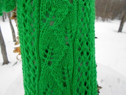 Leaves, always lovely in every season, inspire the essence of spring in this leafy garland. Knit this lacy scarf to keep you warm while thinking spring! The scarf features twisting leaves running up the center, while bordered on the sides with an easy lace pattern. The bottom edges make a nice rippled edging to compliment the pattern. You knit this from the bottom up in halves then join in the center. There are written as well as charted instructions!