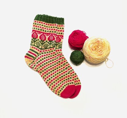 Spring has Sprung! These pretty socks just scream spring and sunshine! Flowers and dots decorate these cute socks getting you ready for spring! The pattern includes easy-to-follow colorwork charts. This pattern is knitted from the top down and features a heel flap and gusset construction. This pattern is written for circular shorties but can be adapted for double-pointed needles or magic loop.