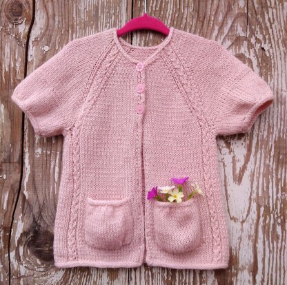 Spring cardigan with puffed sleeves and pockets. It could be knitted with any DK weight yarn. The fiber choice depends mostly on the wearers preferences and the weather, e.g. cotton, linen for hotter climate, or wool, acrilyc for colder climate. The pattern is written for short and long sleeve cardigan.