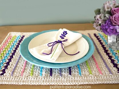 Dress up your spring table with these colorful placemats. The center part is basic single crochet with a little surface crochet striping. The sides are made in a zig zag look for a little fun. Use as many colors as you like and use remnants for the contrasting colors.