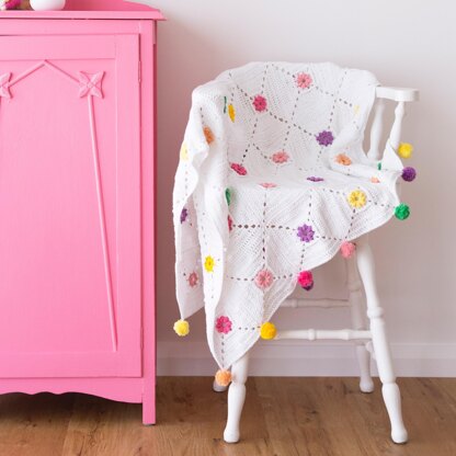 This touchable throw features a rainbow of textured floral centres, surrounded by rounds of crisp white yarn and finished off with fluffy pom-pom embellishments. Featuring Popcorn stitches, back post trebles and stitches in the back loops only for an extra burst of texture. A fun, bright and happy crochet project for Spring!