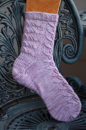 This fun toe up sock features a cute umbrella stitch pattern on the back of the ankle, leaf lace climbing up the front of the leg, and rain drops falling down the sides.