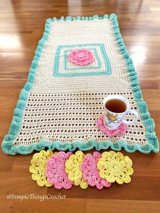 I wanted a vintage look for this table runner so I used Ecru with the pastels to achieve that. You can easily change the colors to match your decor. I also wanted a layered look to the center flower without making it too difficult so I just made three separate flowers and sewed them together! Easy peasy!! This beautiful and easy table runner and coaster set will absolutely brighten up your table this Spring! Table runner - 21” wide x 45” long Coaster - 4 1/2” diameter You will need the following yarn: Lion Brand 24/7 cotton in Ecru - 4 skeins Lion Brand 24/7 cotton in Mint - 2 skeins Lion Brand 24/7 cotton in Pink - 1 skein Lion Brand 24/7 cotton in Lemon - 1 skein