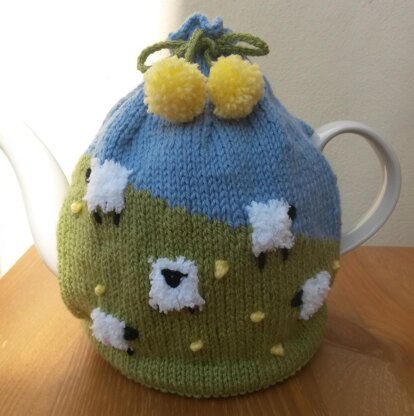 The sheep on a hill cosy is an easy pattern which doesn't use intarsia. The sheep are knit using separate lengths of fluffy yarn with the green or blue yarn held loosely at the back of work.