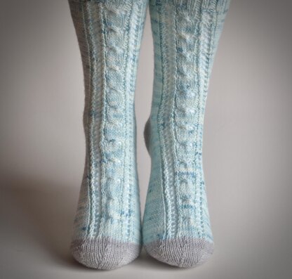 These socks are delicate with a central decorative panel edged with lace. Two heel options and a spiral toe all add up to a soothing and pretty knit.