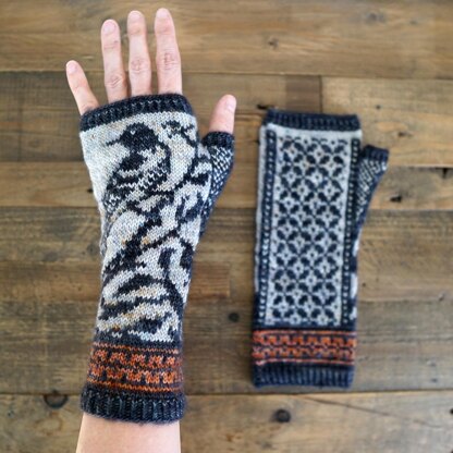 A tribute to hope and change, these stranded mitts feature a pair of orioles perching in leafy branches. In parts of the United States, orioles are considered to be harbingers of spring; they represent a sure sign that the bleakness of winter has given way to warmth and new life. The wide figurative panel on the back of each mitt wraps around to meet a narrower patterned panel along the palm side of the mitt. This pattern is recommended for knitters who have experience with stranded color work, reading from charts, and knitting in the round.