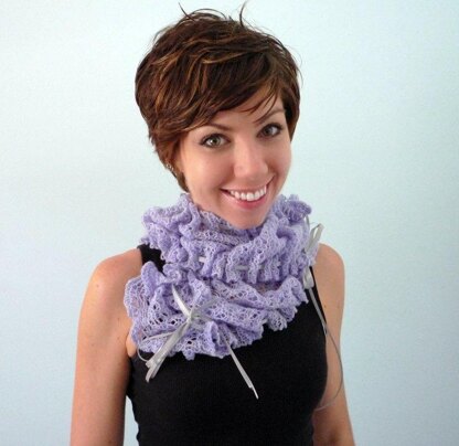 A light and airy scarf with a twisting stitch pattern and cute ruffles. Make it in lace weight or worsted weight or one of each. This pattern knits up quickly and is easy to memorize. Optional lacing feature provides multiple ways to wear this sweet scarf!