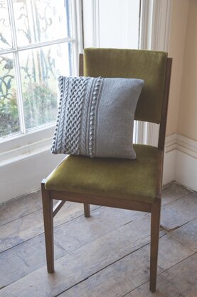 The Aran pattern covers one half of the front of the cushion comprising a broad cable panel with narrow cable and bobble side panels, knitted in Rowan Softyak DK in Plain (232). The rest of the cushion is knitted in stocking stitch.