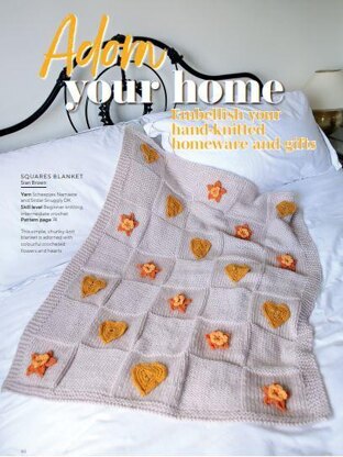This is a pattern for a Squares and Flowers Blanket, originally published in knitting magazine. It is knitted in a chunky yarn in simple knit and purl squares with a garter stitch border, fine for beginners. Crochet flowers and hearts are added to the blanket. These could be replaced by knitted motifs if preferred. Photo Knitting magazine.