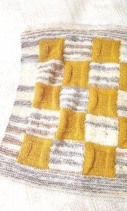 This is a pattern for a squares Cot Blanket, originally published in Knitting magazine. It is worked in intarsia in a chunky yarn, with stocking stitch and knit/prul squares, and a garter stitch border. This would be fine for beginners. Photos Knitting magazine.