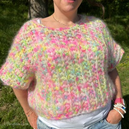 The Squish-it Sweater is a lightweight oversized cropped jumper with gentle shoulder shaping and a round neckline. Made side-to-side with a vertical rib stitch, the boxy, short sleeves reach to the elbow because of the oversized body.