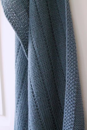 The shawl has a rectangular shape and it is knitted flat from one end to the other. It can be worn as a wrap shawl around the shoulders as well as a scarf around the neck. Three stitch patterns are used in this pattern – Stockinette Stitch, Seed Stitch and 1x1 Ribbing. The edge stitches are worked using an I-Cord technique shown in the pattern. 1x1 Ribbing hems the beginning and the finishing edges.