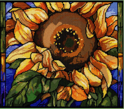 Designed by: Nancy Rossi. Our Stained Glass Sunflowers is a striking design by Nancy Rossi. This design reminiscent of Art Nouveau style has an elegant and timeless feel and would look great in any dГ©cor. This design stitches up equally well as needlepoint since there is no back-stitching. And it is a perfect companion to our Stained Glass Butterflies.\n