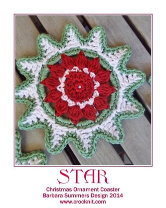 ADD a touch of Christmas colour to your table OR hang on the tree OR make a garland with this TWELVE point STAR ornament coaster. An easy pattern for a three (3) coloured Christmas Ornament Coaster. Made with a lovely mercerized cotton yarn, this makes an easy-care ornament coaster. Use bright OR subdued colours OR traditional red, green and white.