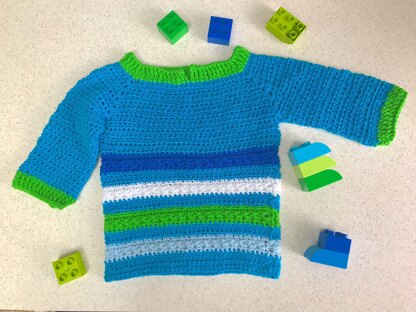 This is a cool spring sweater, sized from new baby to school aged child. It is made using alternate rounds of half trebles and half treble worked in the front loop, which creates a subtle ridged look, and then has stripes around the body in star stitch in different colours. It has loads of great kid-friendly design features - super stretchy around the shoulders and arms for ease of movement, wide neck line so it is easy to get on and off, three quarter length sleeves so the cuffs don’t get grubby, and loads of colour and texture. It also has a cool rib effect at the collar and cuffs which is much lighter than rib is usually.