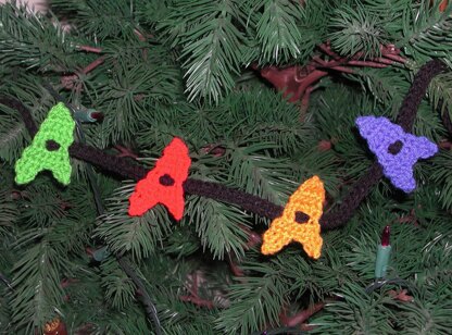 I designed this neat garland as the finishing touch for my Star Trek Christmas tree. However, you can use it anywhere you wish, as any time of the year. It is a garland of Original Series emblems worked in the traditional colors. It is made with scraps of worsted weight yarn on a small hook, for extra stiffness. You can make it as long as you wish.