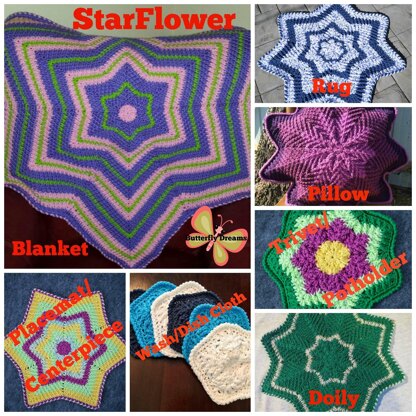 The StarFlower Protean design can be worked into various projects!! You can use any weight of yarn desired and have the option of working 5, 6, 7, 8, or 9 points for versatility! Within this pattern instructions are included for a blanket, rug, doily, placemat/centerpiece, trivet/hotpad/potholder, wash/dish cloth, and pillow (including how to make a ‘custom’ pillow insert). Any of these projects can be worked in the number of points you desire. This design is very versatile and can be worked numerous times, each with varying results depending on how many points you choose, fiber selection, and color and/or striping choice.