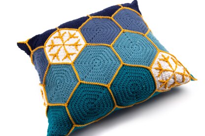 A blanket and cushion set in an ombre of blues representing the night sky, with star motifs. Constructed from hexagons throughout, joined with a pop of mustard. Beautiful home decor to suit a contemporary home. Originally made in Deramores Studio DK, the pattern is updated to include alternative yarn choices in Stylecraft Special DK.