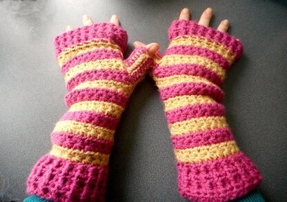These fingerless mitts are made from a combination of crochet ribbing and the impressive-looking but deceptively easy star stitch. The simple stripes and star stitch combine to make the gloves appear much more complicated than they really are.