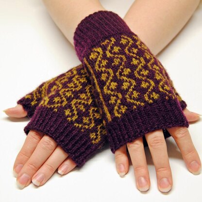 The mitts are worked from the cuff up in two colors of fingering-weight yarn. A long twisted-rib cuff ensures the mitts fit snugly around the wrist. Stitches are increased for the colorwork part to accommodate for the tighter fabric. The mitts have gusseted thumbs, and the vine colorwork pattern is incorporated into the gusset increases. The mitts are finished with twisted rib on top.