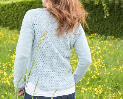 Stayin’ Cool est tricoté du haut vers le bas, en rond et sans coutûre. La dentelle au dos a grand effet mais elle est facile à tricoter! La même dentelle est répétée près de l’encolure au devant. Un superbe pull, très féminin, pour rester “cool” tout l’été.